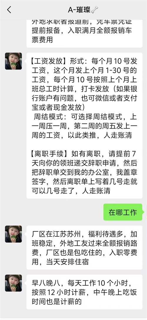 等你到了厂子,厂子那边会告诉你一切的中介全是骗子,但是微信上联系的那个人会说每个月发两次工资,就是所谓的补差价,补差价需要在职,其实就是骗人的,厂子的所有人都告诉你你被骗了,但是你还是不敢信你被骗了,于是你辛辛苦苦的干了一个月。