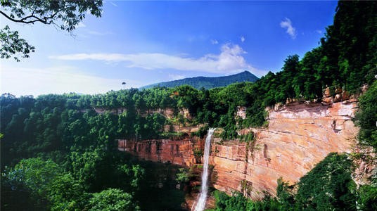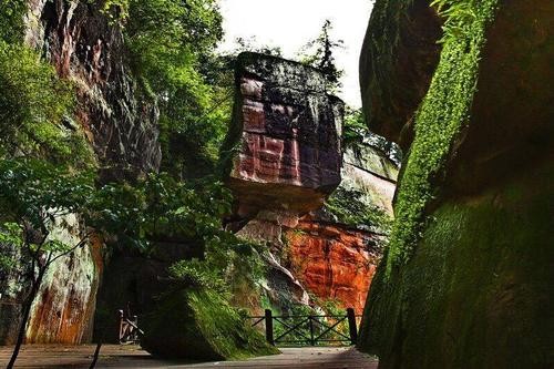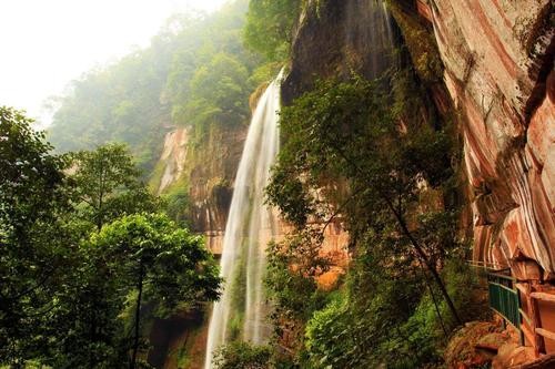 佛光岩景区是中国侏罗纪、白垩纪丹霞地貌发育最好、出露最齐、特色最典型的景区之一。整个景区包括两个景区,佛光岩和五柱峰,佛光岩以丹霞地貌取胜,顾名思义,佛光岩是一处如同佛光的丹霞石壁,顶部为环形,两侧直上直下,就像一本巨大的朱红色天书,还有一泓飞瀑直流而下,壮观又令人震撼。
