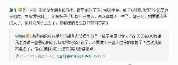 55启卢原伟在微专上发帖称本人女友赵梦玥在G联赛现场惨遭调戏,随即单车也转发了此条微专并说,没有光white女友赵梦玥被调戏,G联赛现场没有少妹子也难幸免。固然未挑明调戏着的身份,然而是许多圈浑家士都心知肚明,赵梦玥夹腿门事变由此启始。
