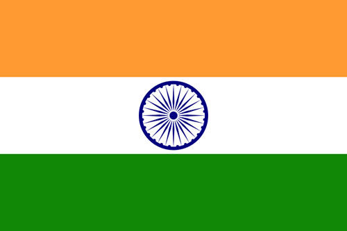印度国旗:旗面由橙,白,绿三个相等的横长方形组成。旗面中心有一个含24根轴条的蓝色法轮。橙色象征了勇气,献身与无私,也是印度教士法衣的颜色,白色代表了真理与和平,而绿色则代表繁荣,信心与人类的生产力。法轮是印度孔雀王朝鼎盛的阿育王时代佛教圣地石柱柱头的狮首图案之一,神圣的法轮象征着真理与道德,也代表了印度古老的文明。法轮的24根轴条则可代表一天的24小时,象征国家时时都向前进。