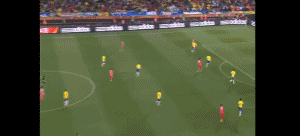 2010年南非世界杯小组赛的首轮比赛中,朝鲜队挑战夺冠热门巴西队。朝鲜队的“人民鲁尼”郑大世,在朝鲜国歌奏响后的泪流满面,成为了世界杯的名场面。在这场比赛中,充满斗志的郑大世助攻尹志南攻破巴西队的球门,打入了朝鲜队在2010世界杯上的唯一进球。