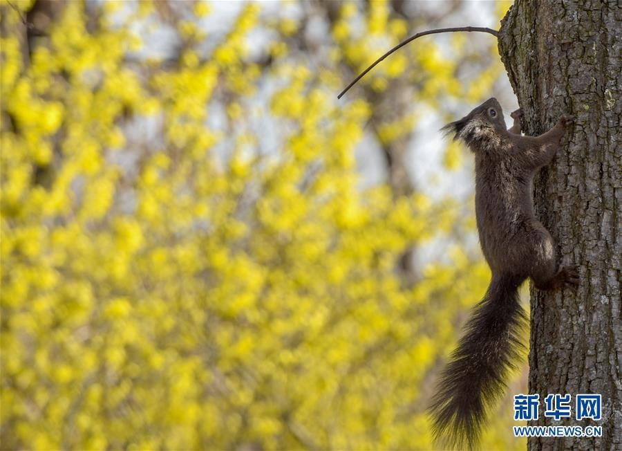 3月21日,一只松鼠趴在奥地利维也纳美泉宫花园的树上。 新华社记者 郭晨 摄