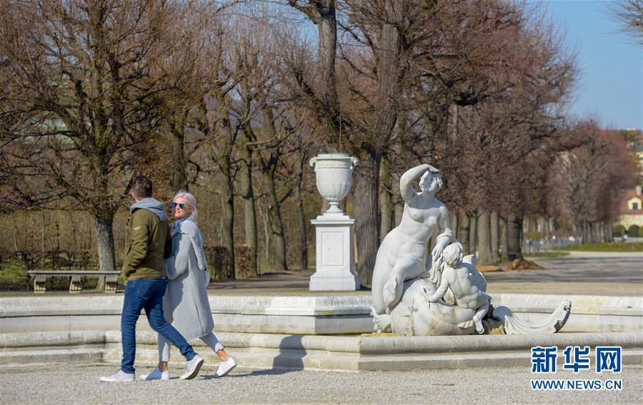 3月21日,游客走过奥地利维也纳美泉宫花园内的雕塑。 新华社记者 郭晨 摄