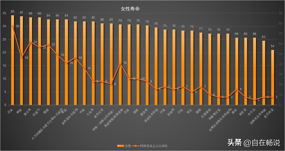 可以看到在女性寿命达到80岁以上国家中,我国的65岁及以上人群占比基本处在中间位置,占比14%,暂时远少于日本的30%。