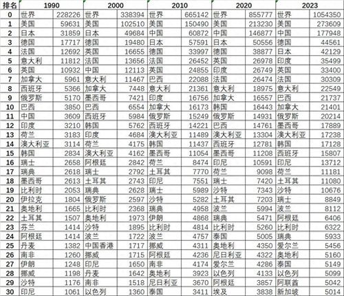 世界三十大经济体GDP排行榜(1990-2023)