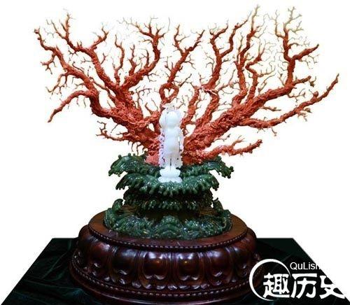 慈禧尸身右侧,搁着一枝玉雕红珊瑚树,上绕青根绿叶红果的蟠桃一枝,树顶处停降一只翠鸟。还有宝石制成的桃、李、杏、枣二百多枚。身左搁玉石莲花,身右搁玉雕珊瑚树。其余,玉石骏马八尊,玉石十八罗汉,总计七百多件。埋葬完成,又倒进四升珍珠和红、蓝宝石二千二百块,弥补棺内间隙;四升珍珠中有八分大珠五百粒、二分珠一千粒、三分珠二千二百粒;宝石与珍珠约值银二百二十三万二。图为玉雕红珊瑚树。