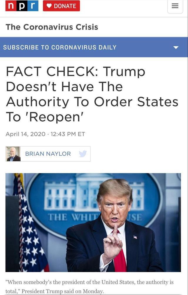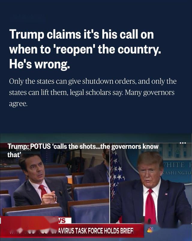 特朗普:我有“千万于权利” 美媒:不,你不!为催促各州尽量从新开搁、沉开经济。据《本日美国报》报讲,特朗普在13日的新闻记者会上搬出了 “千万于权利”。