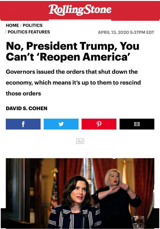 CNBC撰文称,特朗普宣称本人具有“千万于权利”令各州经济沉开是虚伪的。
