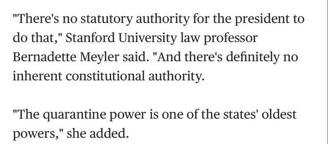在接收 MSNBC新闻网采访时,科莫说: “这并不是宪法所确定的。领袖昨晚所说的有违宪法。特朗普这是在公布本人是国王。”