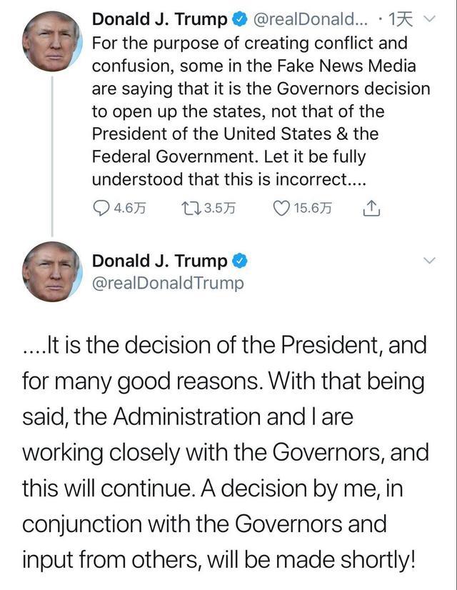 随即特朗普在社接媒介上表现,各州的开搁由本人作决断,而不是各州州官,且本人有充溢的缘由这样干。
