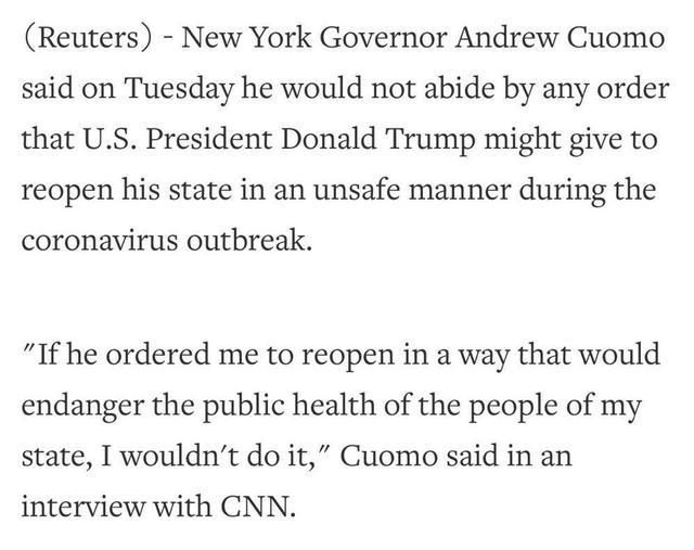 另外,科莫还正告说,假如白宫央求纽约强行沉开经济,将会形成几十年未睹的“宪政紧急”。