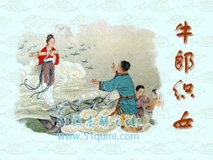传说天上有织女星和牵牛星,织女和牵牛情投意合,但是天条律令不允许男欢女爱,便将牵牛贬下凡尘,织女不停织云锦惩罚。织女天天以泪洗面思念牵牛,而牵牛被贬下凡后落入一户农家取名牛郎,牛郎的哥嫂对牛郎非常刻薄便和他分家,牛郎只得和老牛相依为命。