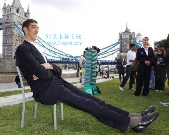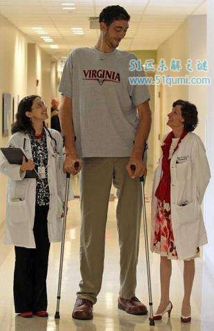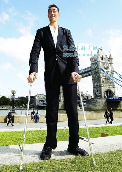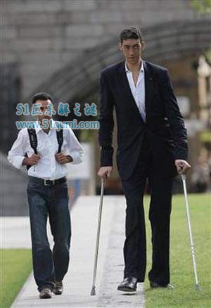 现年34岁的土耳其小伙苏尔坦·科森身高2.47米,取代身高2.36米的中国男子鲍喜顺,被吉尼斯世界纪录确认为新科“世界第一高人”。苏尔坦·科森来自土耳其东部的小镇马尔丁,在家里的5个孩子中,科森虽排行老二,但个子却是最高的。家中3个兄弟和1个妹妹身高均属正常。从10岁起,苏尔坦体内长了个肿瘤,造成脑垂体释放过多生长激素,从此身高激增,成为“巨人”。直到去年,他通过手术切除了肿瘤,这才停止长高。不过,目前的他必须借助手杖和轮椅的帮助,才能正常行走。