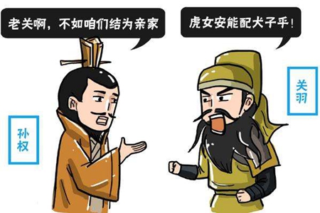 其一,关羽不会处理政治关系。起初东吴孙权有意与蜀汉刘备联合起来一起对抗曹魏曹操,而结盟通常的办法就是联姻,孙权派使者向关羽提亲,他不但当面拒绝,还抛出一句:“虎女焉能配犬子”当众侮辱孙权的儿子。