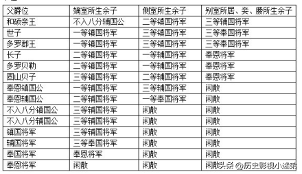 再往下依次是多罗贝勒;固山贝子;奉恩镇国公;奉恩辅国公;不入八分镇国公;不入八分辅国公;镇国将军;辅国将军;奉国将军;奉恩将军。