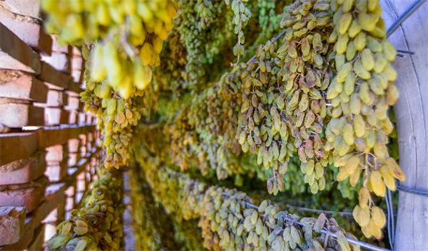 而房子上的孔是用来放木架的,等到葡萄成熟后,把摘来的葡萄放在阴房里面后,会把门关死,而因为当地气温较高,大概一个月左右之后,这些葡萄也就成了葡萄干,当地人就会拉去卖。