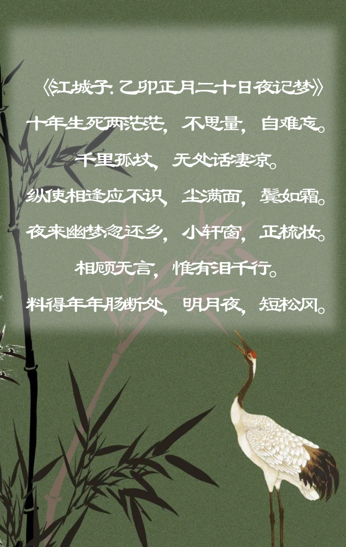 《江城子》是词牌名,而乙卯正月二十,是公元1075年的正月20,那天晚上,苏轼做了一个梦,梦到了自己的结发妻子王弗,于是,决定把这个梦境记录下来。