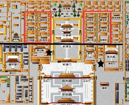 按照《清史稿·志九十三·职官三(内务府)》的记载,御膳房乃系归属于内务府管辖的职能机构,管理皇帝、后妃及宫中其他皇室成员等人员的饮食及典礼筵宴等事宜。在紫禁城中,御膳房有两处:外御膳房和大内御膳房。如下图所示,可以明确看出这两处御膳房(黑色五角星标注地)的位置,均处于后妃所在后宫之外。