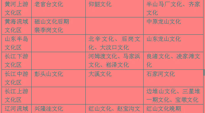 在空间上,可以分为长江中游文化区、长江下游文化区、黄河上游文化区、黄海文化区、山东半岛文化区和辽河流域文化区等。具体的情况如表格所示。