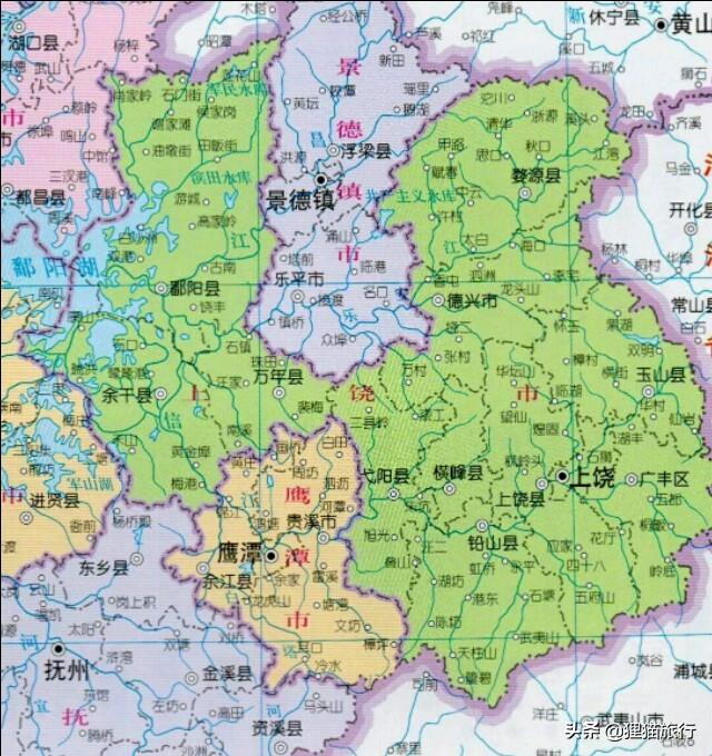 虽然景德镇与鹰潭距离鄱阳湖也不远,流经景德镇的昌江、流经鹰潭的信江,都注入鄱阳湖,但由于区划的原因,江西最东边的上饶市有一部分鄱阳湖水面,隔着鹰潭和景德镇,上饶的余干县。
