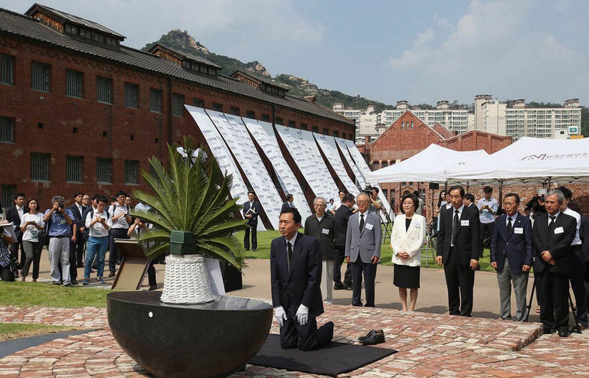 2015年,鸠山由纪夫访问韩国,在参观首尔“西大门刑务所”博物馆后,鸠山由纪夫在追悼碑前跪地祷告。