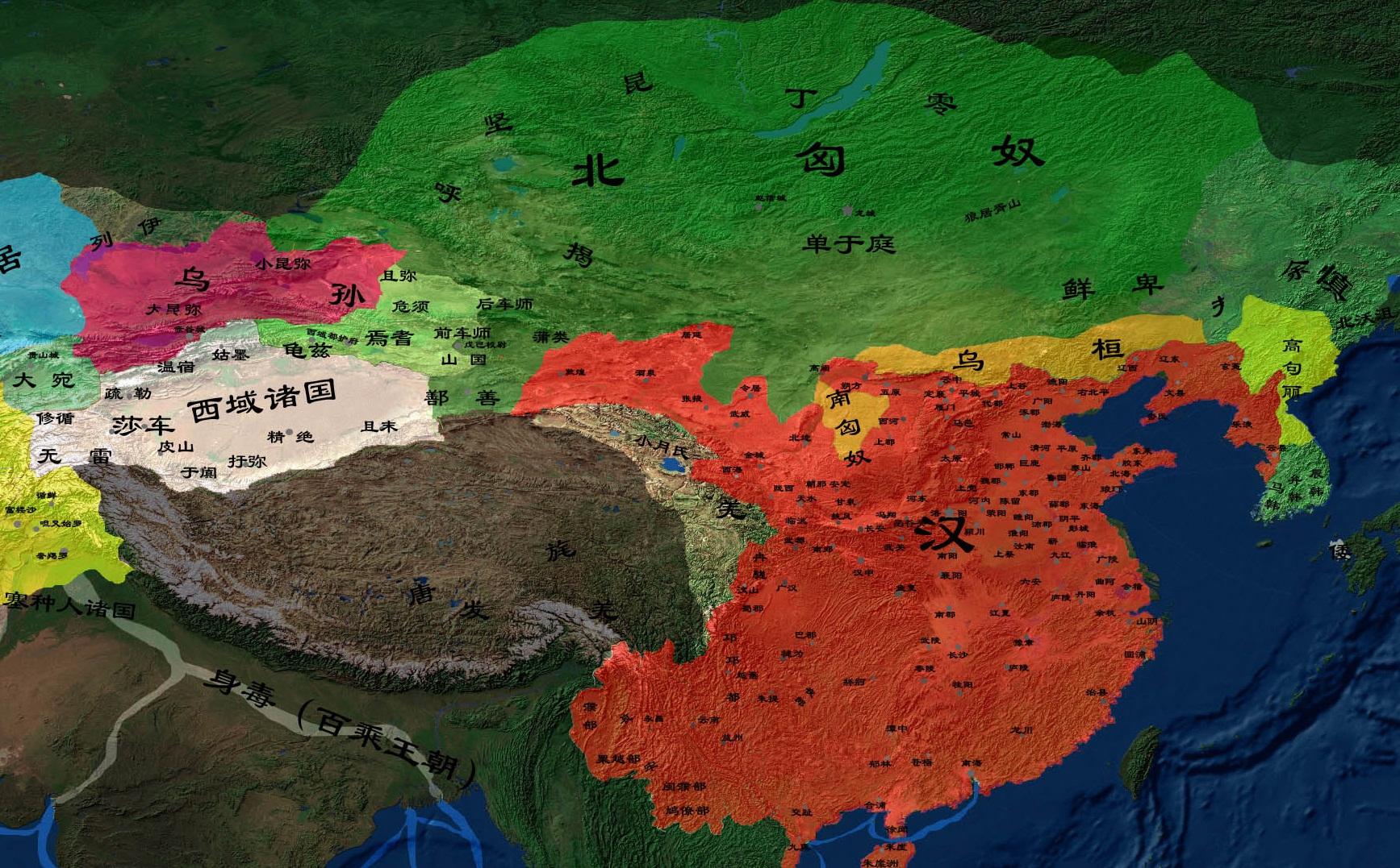 公元前68年,呼韩邪单于降汉后,汉朝疆域