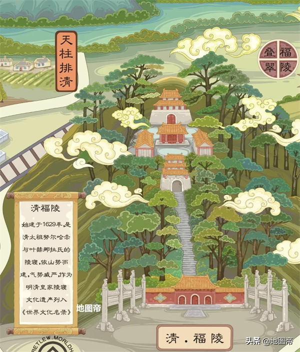 沈阳福陵,俗称东陵,位于沈阳市东北郊外,是努尔哈赤与后妃叶赫那拉氏、博尔济吉特氏等人的合葬陵墓。陵园南临浑河,北靠天柱山,气势宏伟,风景优美。