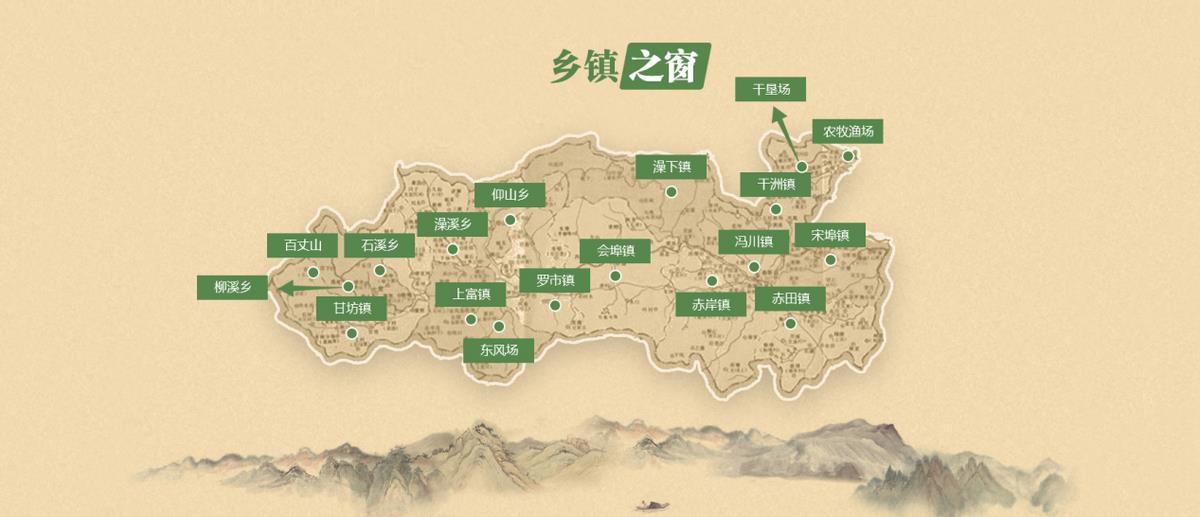 2004年12月,全县设有冯川、赤岸、赤田、宋埠、干洲、磉下、会埠、罗市、上富、甘坊等10个镇,仰山、澡溪、柳溪等3个乡以及石溪办事处、百丈山风景名胜区,下辖146个村民委员会、1366个村民小组,4个社区管理委员会、10个社区居民委员会(含社区);东风垦殖场、干洲垦殖场、农牧渔良种场共下辖15个分场。境内还有大港林场和省救助站。