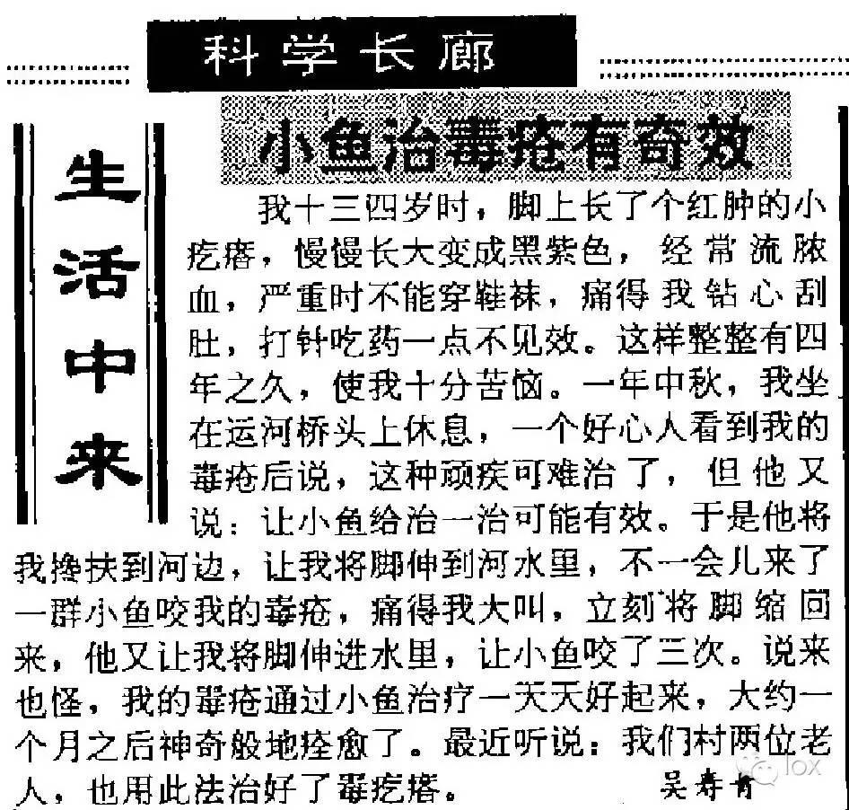 生活中来,是晚报的老栏目。有读者来信,说脚上长毒疮,偶然间在小河边把脚伸进去,居然被小鱼啃食光了。