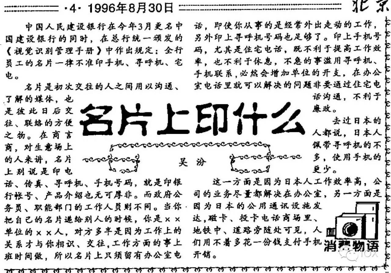 吴汾老师的评论。建行规定,职工不得在名片上印手机号码、寻呼机号码、住宅电话。