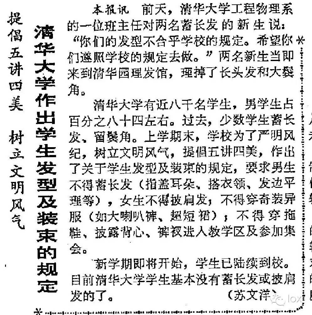 按理说大学是一个前卫的世界。然而这个时代的清华大学,学校对着装外貌提出要求,男生不许留长发,女生不许披肩发、不得穿喇叭裤、超短裙等。