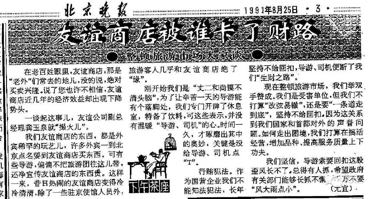 友谊商店,生意差了。为什么?因为不给导游、司机“点T”。T就是钱,北京土话。