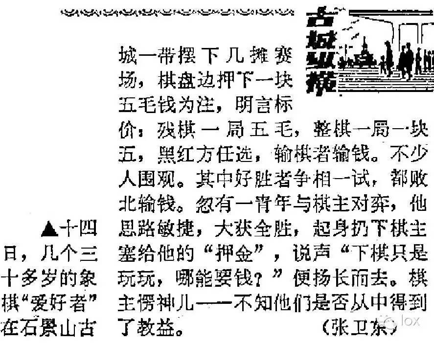 路边摆棋势,过去很常见。一步走不对,您就输钱。石景山古城的一个高人,看来水平不低,赢了摊主,却并不要钱。“下棋只是玩玩,哪能要钱?”