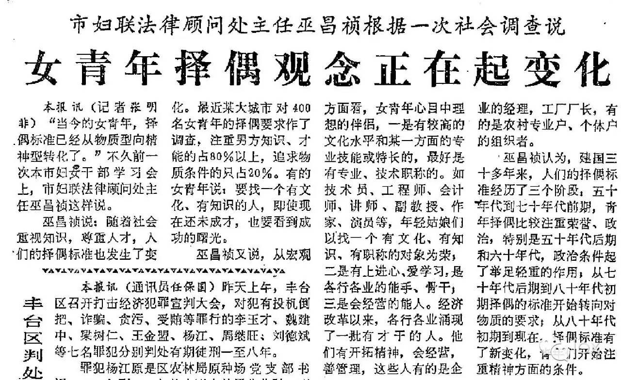 市妇联一位主任说,女青年的择偶观发生变化,注重男方知识、才能的占到八成,只有两成追求物质条件。当时我们认为这是一种进步。