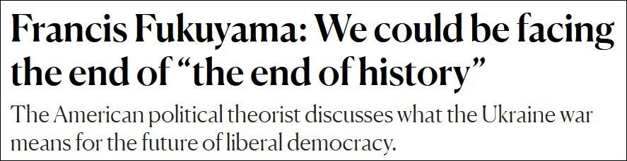 福山的结论是:西方还是要团结,要和所谓“非民主国家”斗争。他说“如果美国和西方不能阻止中俄等国家主导世界,将意味着‘历史终结论’的终结。”
