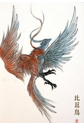 《山海经·海外南经》:“比翼鸟在(结匈国)其东,其为鸟青、赤,两鸟比翼。一曰在南山东。”又山海经《西山经》:“崇吾之山......有鸟焉,其状如凫,而一翼一目,相得乃飞,名曰蛮蛮,见则天下大水。”