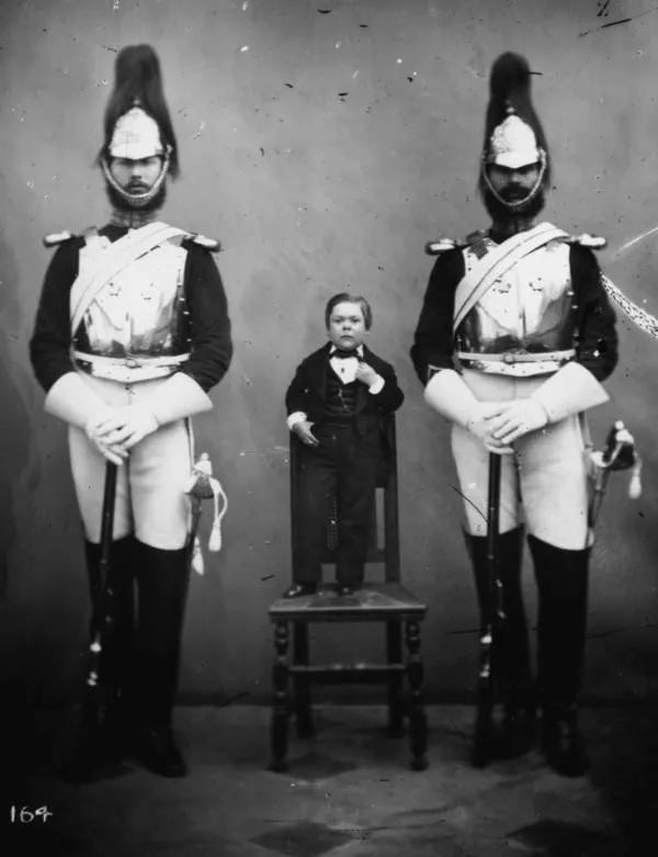 乔治舍伍德斯特拉顿(George Sherwood Stratton),更为人所知的是汤姆拇指将军,站在两个警卫之间的椅子上。拍摄于1860 年。