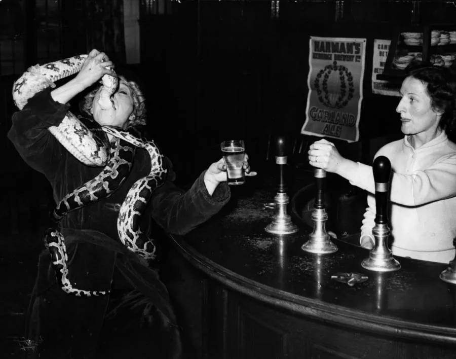马戏团表演者米莉·凯耶斯在佩吉布拉德福德酒店的酒吧里吞下了一条 12 英尺长的蟒蛇的头。拍摄于1952 年。
