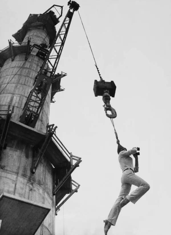 德国马戏表演者被头发吊到 656 英尺。拍摄于1960 年