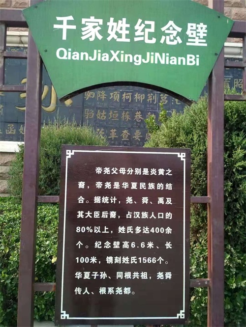 在尧庙宫的门前有一个大大的广场,尧庙正门的过道把广场一分为二,在西广场的正中间是高大的华表和微缩的中国地形景观,在西广场的北边有铁质的中华人民共和国的政区图,广场的最西边有一道长达100米,高6.6米的千家姓纪念壁,在千家姓纪念壁的正中有一个象征着华夏子孙,同根共祖的铁制树根。