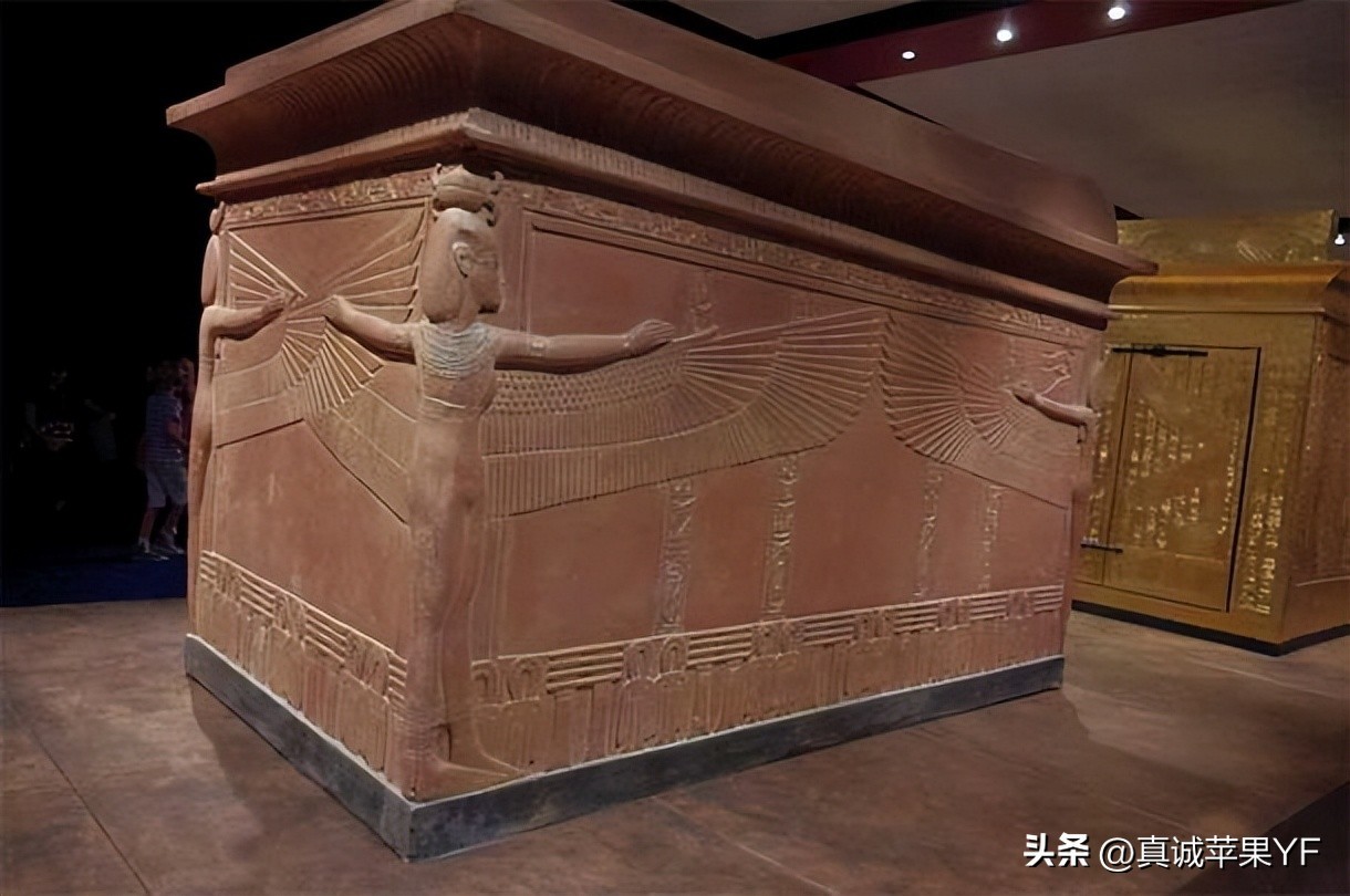 图坦卡蒙的石英石棺包含三个相互嵌套的棺材。石棺的下半身由棕色石英岩制成,盖子由粉红色的花岗岩制成,颜色与盒子的颜色一致。石棺上雕刻着四位女神伊希斯、奈芙蒂斯、奈斯和塞尔克特的雕像,四角高浮雕,她们的翅膀展开以保护石棺内的身体。