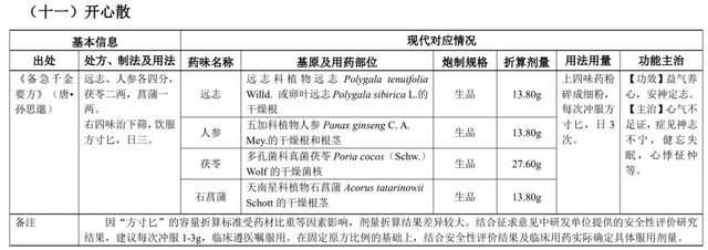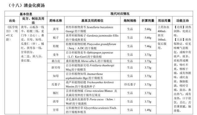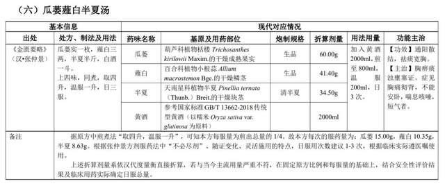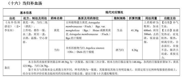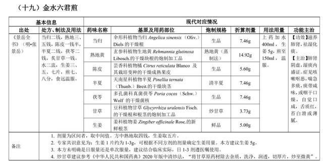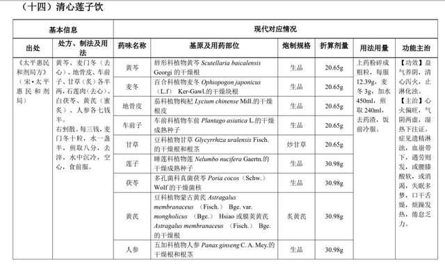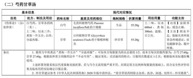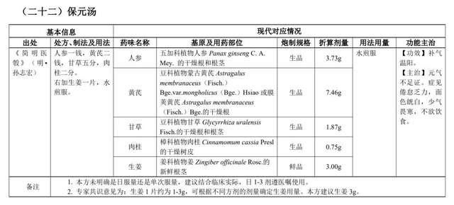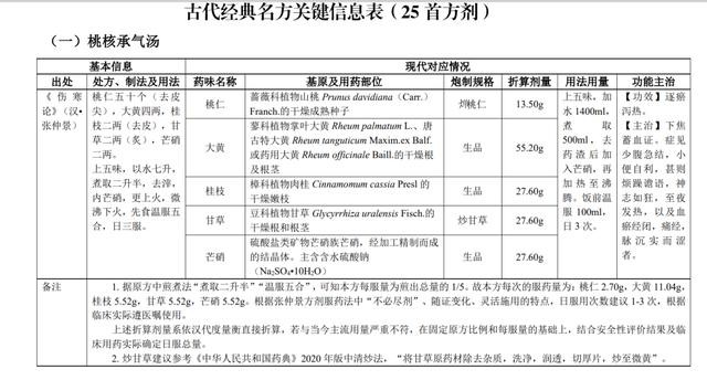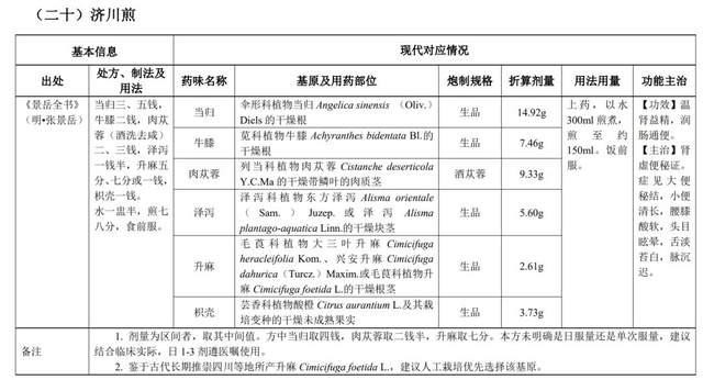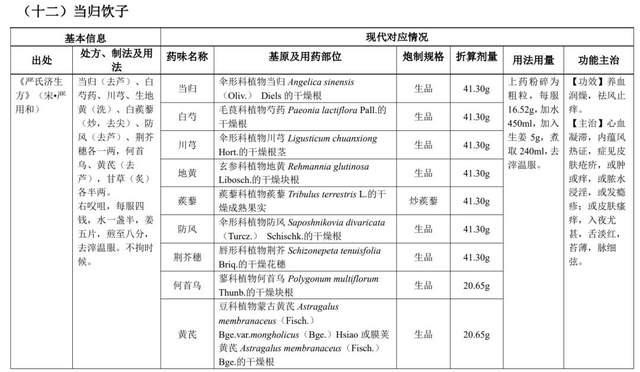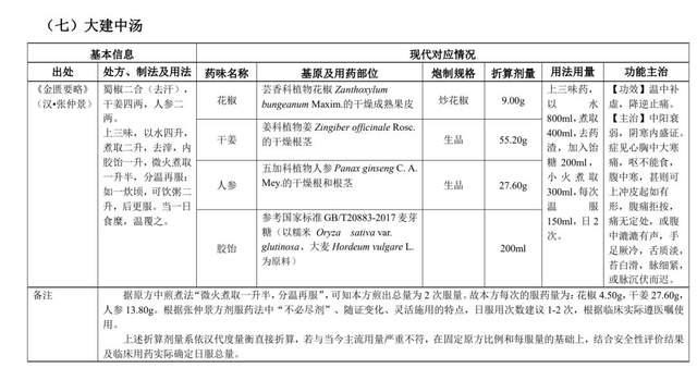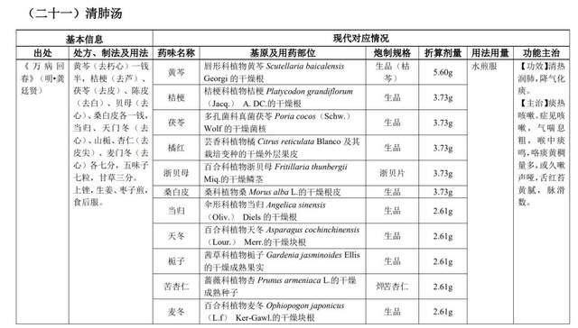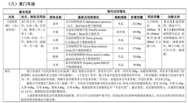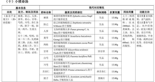 该《关键信息表》提供了首方剂的2项基本信息(出处和处方、制法及用法)和6项现代对应情况(药味名称、基原及用药部位、炮制规格、折算剂量、用法用量、功能主治等内容)。