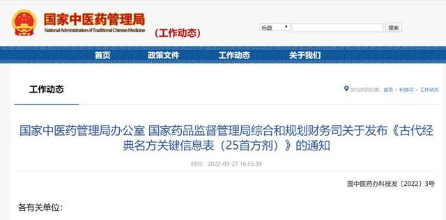 国家中医药管理局和国家药品监督管理局近日联合发布《古代经典名方关键信息表(25首方剂)》(附后),其中包括小续命汤、开心散、清肺汤等25首方剂。