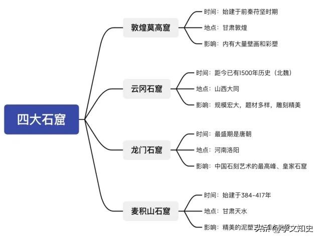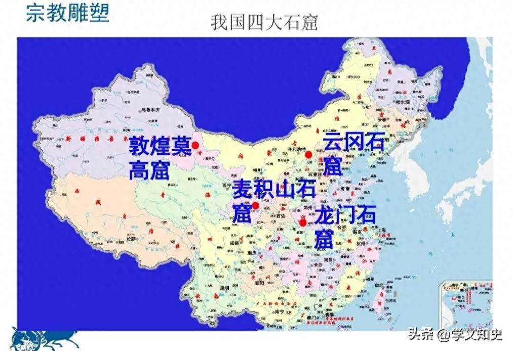 在四大石窟中,敦煌莫高窟以壁画著名,麦积山石窟、云岗石窟、龙门石窟以佛教造像(佛像雕塑)著名。