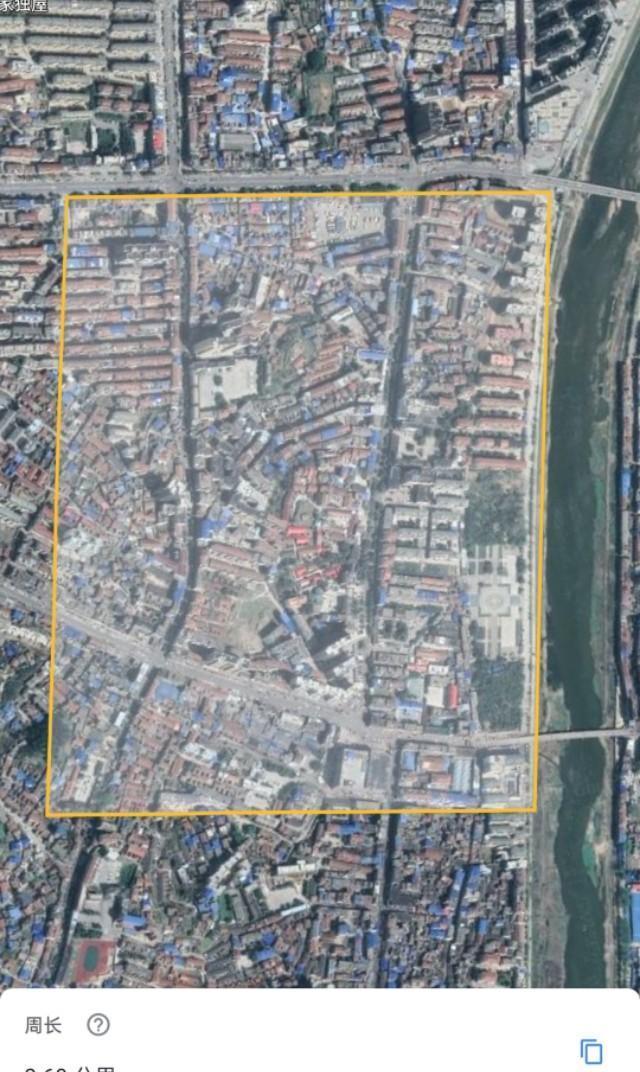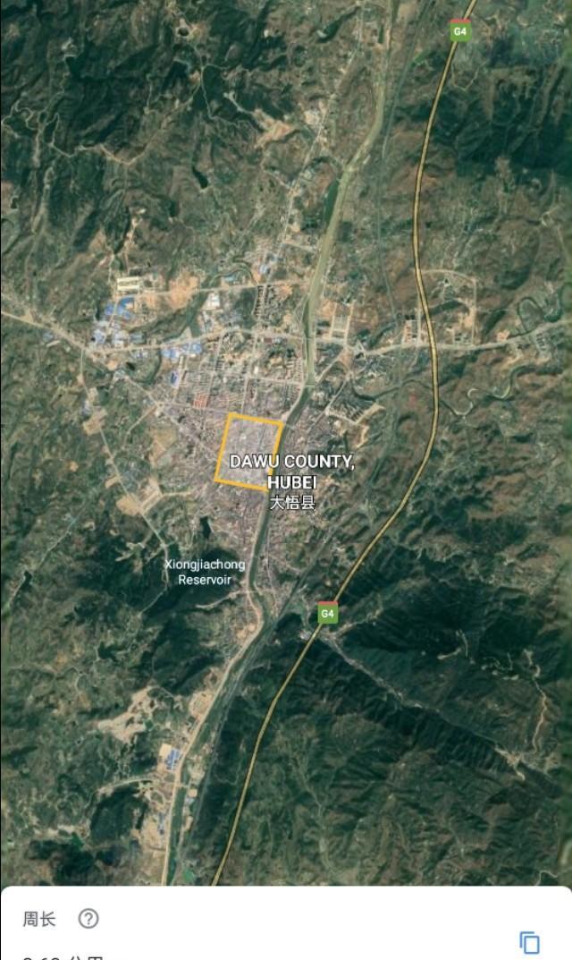 我们去除护城河不算,只计算城内面积,按照南北长961米,东西宽753米,在孝感市大悟县县城的地图上画出来,看看究竟是多大?