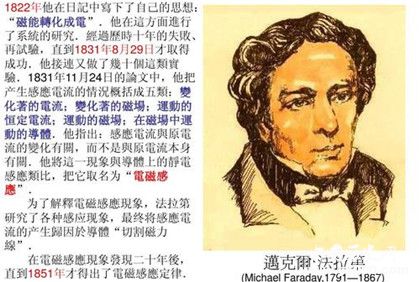 (4)他的展示向世人建立起“磁场的改变产生电场”的观念。此关系由法拉第电磁感应定律建立起数学模型,并成为四条麦克斯韦方程组之一。这个方程组之后则归纳入场论之中。法拉第并依照此定理,发明了早期的发电机,此为现代发电机的始祖。