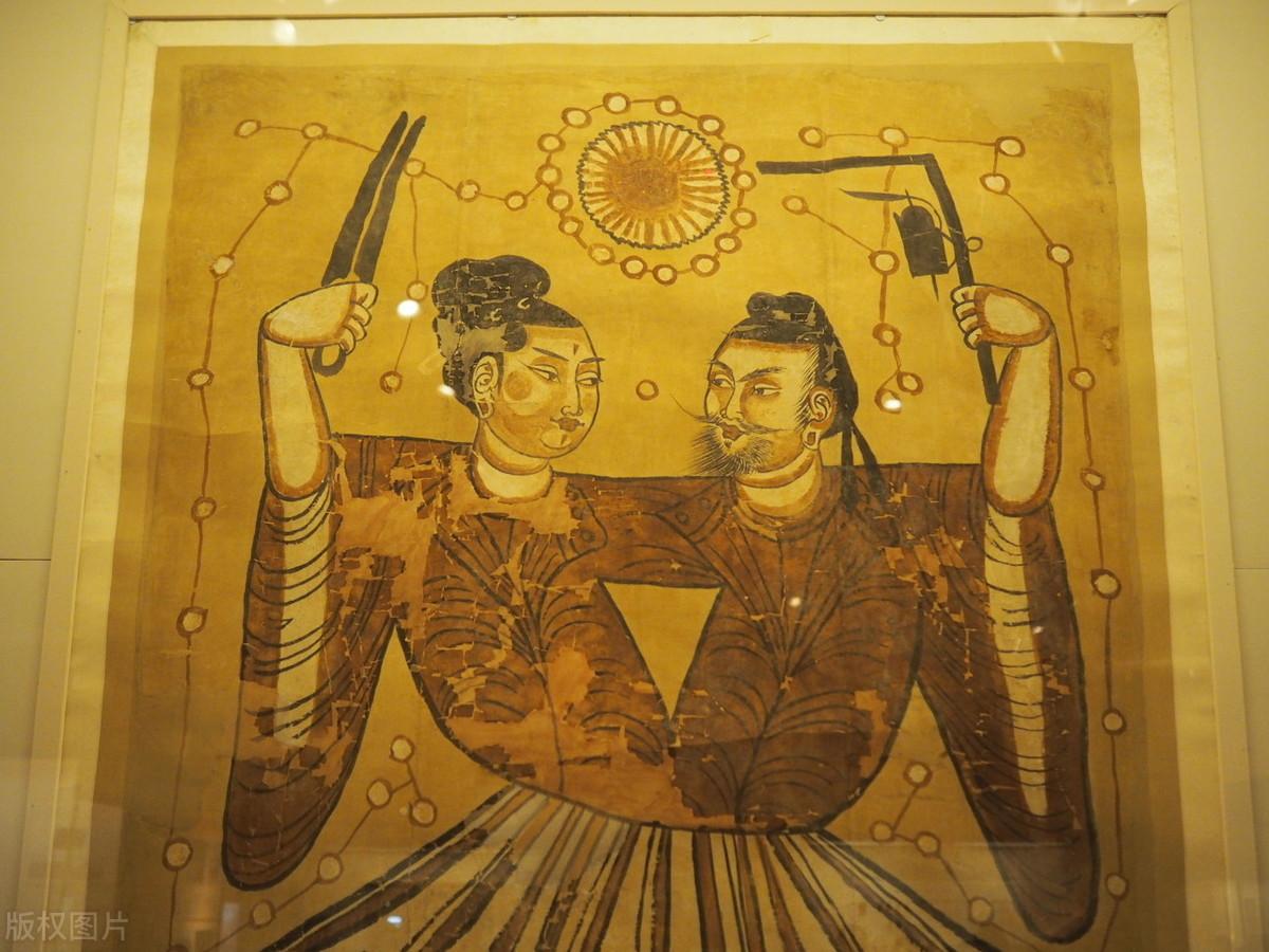 伏羲女娲彩绘麻布画,收藏于新疆维吾尔自治区博物馆