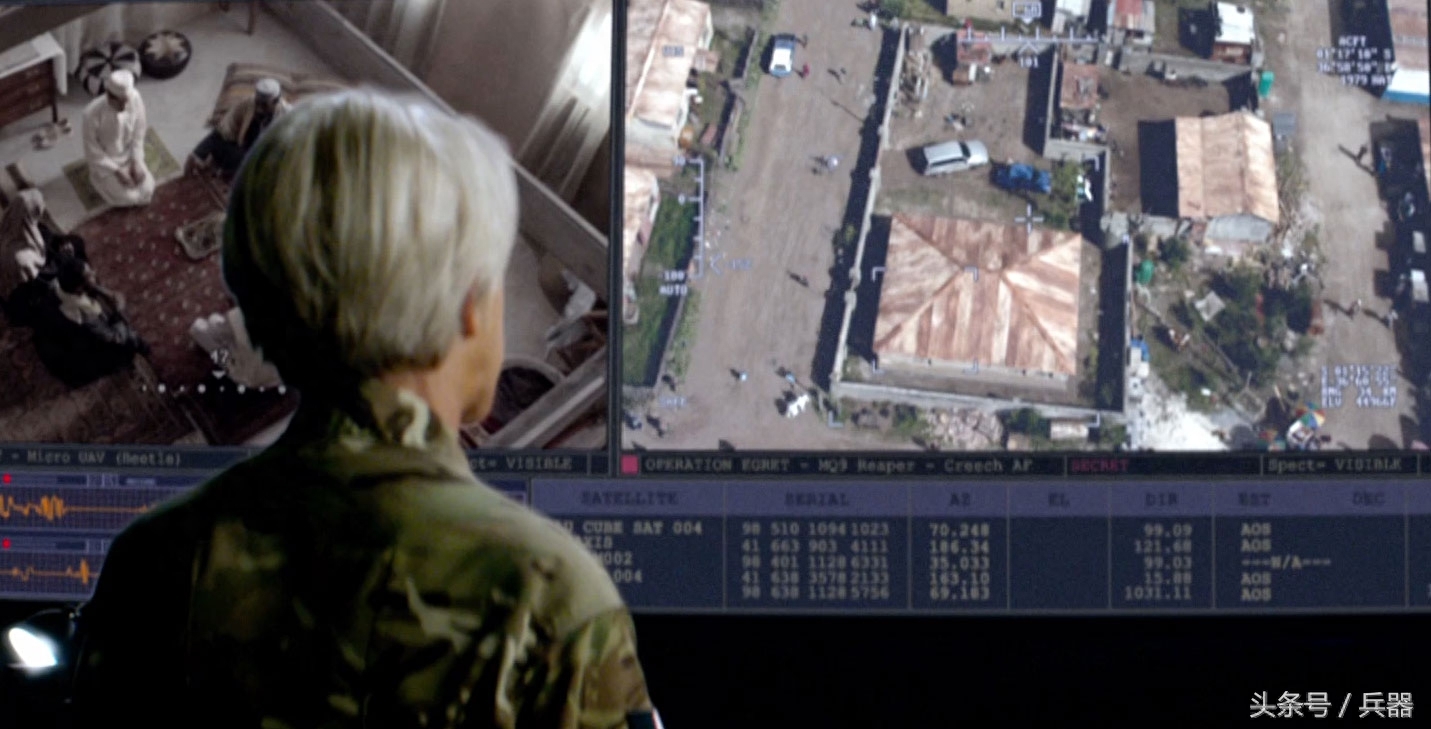 这还不是最小的一只。当肯尼亚特工机智地潜入难民营之后,接近了恐怖分子集结的民宅。英国女军官要求他尽快查明屋内情况,观众正在猜测他会以什么理由敲门进屋,是查水表还是送快递?他却从怀里摸出一台PSP 游戏机样的东西,又从烟盒里拿出一只黑色甲虫,打开游戏机,按下挡纵钮,甲虫就飞了起来, PSP上出现了甲虫拍摄的图像,这也是一种无人机!在片中,正是这种甲虫无人机确认了苏珊的身份,还发现了恐怖分子们正在准备的自杀袭击装备,促使鲍威尔下定了击杀的决心。