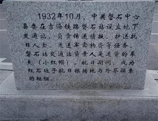 一九三二年十月,中国共产党磐石中心县委在吉林至海龙的铁路线上的磐石火车站设立了“地下交通站”。