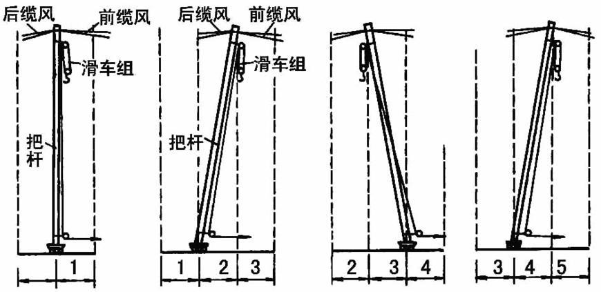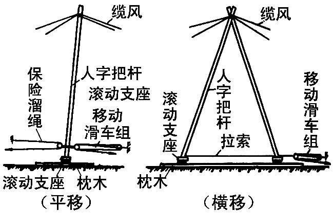 先将后缆风慢慢放松,同时收紧前缆风,使扒杆向移动的一侧倾斜(角度不超过100),然后用卷扬机拖拉扒杆下部,将扒杆下部向前移动到扒杆向后倾100,按此反复动作,即将扒杆移动需要位置。
